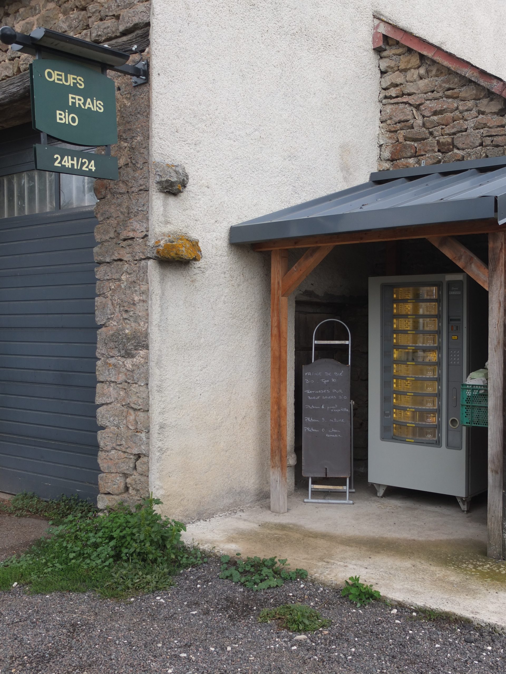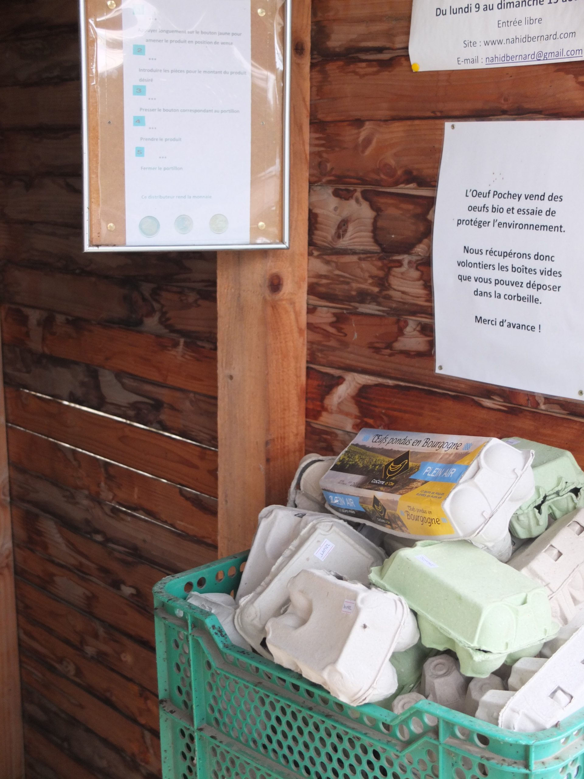 Les œufs, la farine, et des terrines sont mis à disposition dans un distributeur automatique, pensez à prendre quelques pièces et à rapporter vos boîtes vides !